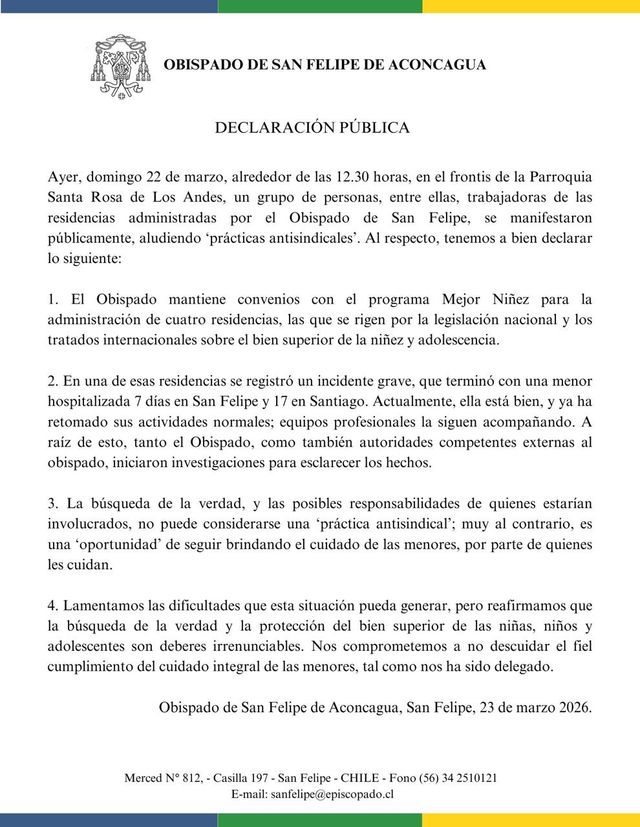 A propósito de la manifestación registrada este domingo por el sindicato de trabajadoras de residencias de menores, el Obispado de San Felipe de Aconcagua emitió una declaración pública donde señala que mantiene convenios con el programa Mejor Niñez para la administración de cuatro residencias, las cuales se rigen por la legislación nacional y tratados internacionales orientados a resguardar el bienestar de niños, niñas y adolescentes. La protesta, desarrollada alrededor de las 12:30 horas en el frontis de la Parroquia Santa Rosa, incluyó denuncias de supuestas prácticas antisindicales por parte de las trabajadoras.