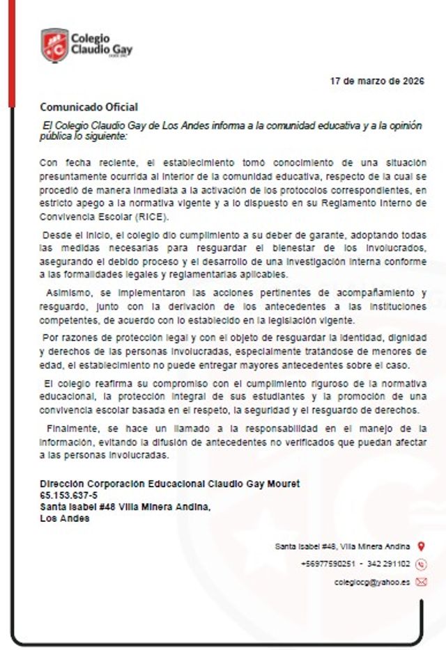 El Colegio Claudio Gay de Los Andes informa a la comunidad educativa y a la opiniónpública lo siguiente: